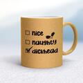 The Dickhead List Mug A rude mug with checkboxes for nice, naughty and dickhead, with dickhead selected printed on both sides. Simple and straight to the point this rude mug is great as a gift for...