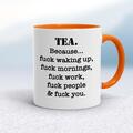 Tea Because Mug A rude mug with "TEA. Because... fuck waking up, fuck mornings, fuck work, fuck people & fuck you." printed on both sides. Simple and straight to the point this rude mug is great...