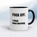 Fuck Off I Mean Good Morning Mug A rude mug with "Fuck Of.f I Mean Good Morning." printed on both sides. Simple and straight to the point this rude mug is great as a gift for any occasion. Our F...