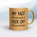 My Face Tells More People To Fuck Off Mug A rude mug with "My face tells more people to fuck off than my mouth does" on both sides. Simple and straight to the point this rude mug is great as a g...