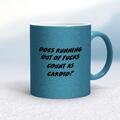 Running Out of Fucks Mug A rude mug with "Does Running Out Of Fucks Count As Cardio?" printed on both sides. Simple and straight to the point this rude mug is great as a gift for any occasion. O...