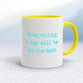 Everything I Say Will Be On The Test Mug A novelty mug with "Everything I Say Will Be On The Test" printed on both sides. Simple and straight to the point this novelty mug is great as a gift for...