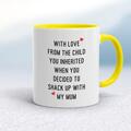 From The Child You Inherited Mug A rude mug with "With Love From The Child You Inherited When You Decided To Shack Up With My ..." Mum or Dad printed on both sides. Simple and straight to the po...