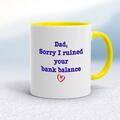 Ruined Your Bank Balance Mug A novelty mug with "Dad, Sorry I Ruined Your Bank Balance" printed on both sides. Simple and straight to the point this novelty mug is great as a gift for any occasi...