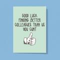 Good Luck Finding Better Colleagues CardA rude greetings card with 'Good Luck Finding Better Colleagues Than Us You Cunt' printed on the front. This rude greetings card is great for anyone and ide...