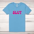 Pink Slut Adult T-Shirt A rude adult t-shirt with "SLUT" in a pink bold font printed across the front of a 100% cotton* t-shirt. This rude t-shirt is great as a gift for any occasion. All of our...