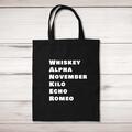 Whiskey Alpha Tote Bag A rude shopping bag with "Whiskey Alpha November Kilo Echo Romeo", from the NATO phonetic alphabet printed on the front of a 100% cotton tote bag. This rude bag is a perf...