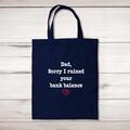Ruined Your Bank Balance Tote Bag A novelty shopping bag with "Dad, Sorry I Ruined Your Bank Balance" printed on the front of a 100% cotton tote bag. This novelty bag is a perfect replacement fo...
