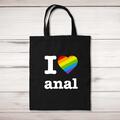 I Love Anal Pride Tote Bag A rude shopping bag with "I Love Anal" with a Pride rainbow heart printed on the front of a 100% cotton tote bag. This rude bag is a perfect replacement for plastic ba...