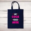 My Cock Your Arse Tote Bag A rude shopping bag with "My Cock Your Arse" printed on the front of a 100% cotton tote bag. This rude bag is a perfect replacement for plastic bags in retail, superma...
