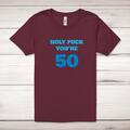 Holy Fuck You're 50 Adult T-Shirt A rude unisex adult t-shirt with "Holy Fuck You're 50" printed across the front of a 100% cotton* t-shirt. This rude t-shirt is great as a gift for any occasion...