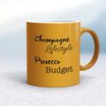 Champagne Lifestyle, Prosecco Budget Mug A novelty mug with "Champagne Lifestyle, Prosecco Budget" printed on both sides. Simple and straight to the point this novelty mug is great as a gift for...