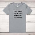 I Don't Always Test My Code Adult T-Shirt A geeky unisex adult t-shirt with "I Don't Always Test My Code But When I Do, It's In Production" printed across the front of a 100% cotton* t-shirt. Th...