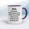Tea Because Mug A rude mug with "TEA. Because... fuck waking up, fuck mornings, fuck work, fuck people & fuck you." printed on both sides. Simple and straight to the point this rude mug is great...