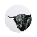 A ceramic coaster with Angus Heilan Bull artwork on it.