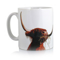 A ceramic mug featuring a hand-drawn image of a highland cow taken in Harris.